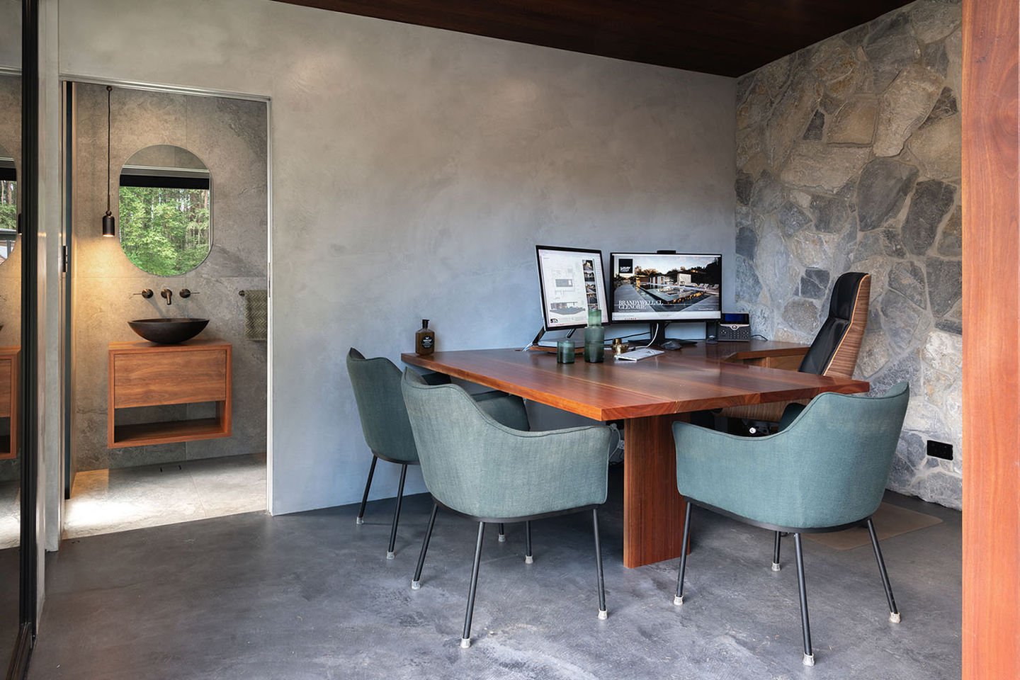 The wellness room features exquisite hardwood finishes & innovative Xbond flooring & walls, achieving a chic, burnished concrete look on lightweight wood structures. Stone-clad walls & custom-built wooden bookshelves complete the aesthetic.
