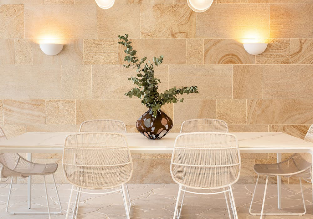 Areia wall cladding combines the strength and durability of granite with the visual characteristics of banded sandstone. Designed by Artisan Exterior, this interlocking linear wall cladding runs over 300mm and 400mm coursed heights.